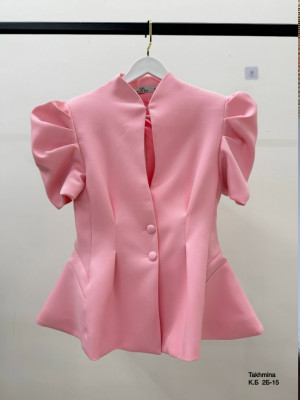 Элегантный жакет с укороченными рукавами и выразительной баской подчёркивает изящные линии, формируя утончённый образ. Дизайн с буфами на плечах добавляет оригинальности и делает внешний вид более выразительным, а аккуратная стойка придаёт завершённость и особый шарм. Размеры: S, M